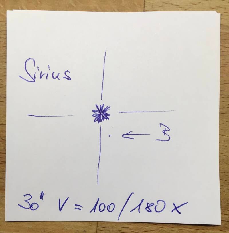 Beim Justieren des Telrad Suchers am 30“ Dobson wurde Sirius eingestellt, und ich konnte auf Anhieb bei 100x den Begleiter Sirius B im direkten Anblick als kleines Sternchen, etwas abseits des gleißend hellen Sirius erkennen.