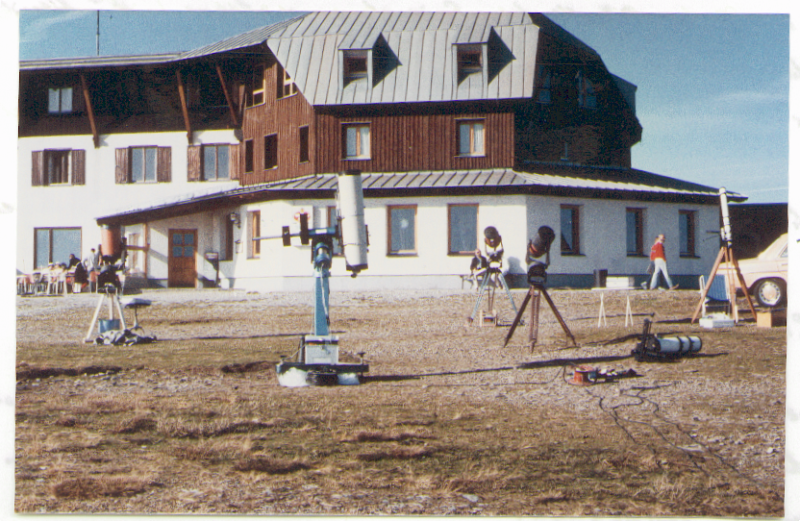 Stifters Gipfelhaus war unsere Herberge beim 2.ITT 1986. Ganz rechts mein Unitron Fernrohr und das Heck vom 200D /8 Mercedes