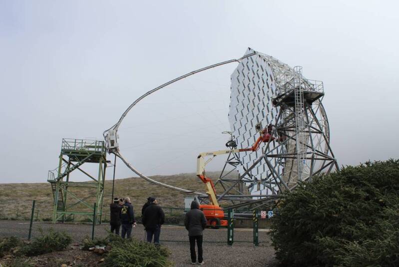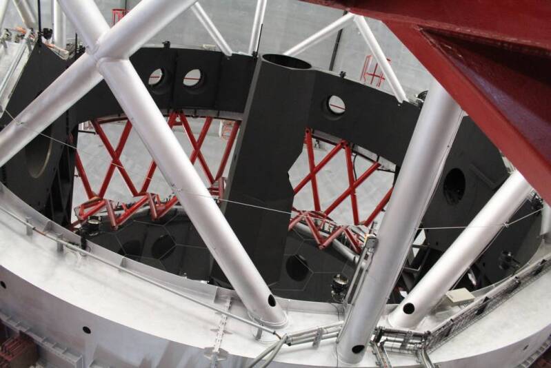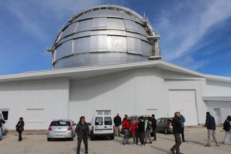 Teleskopen in die Kuppel des GTC wo wir dieses Mal das zum Horizont heruntergeschwenkte 10,4 Meter Teleskop bewundern durften.