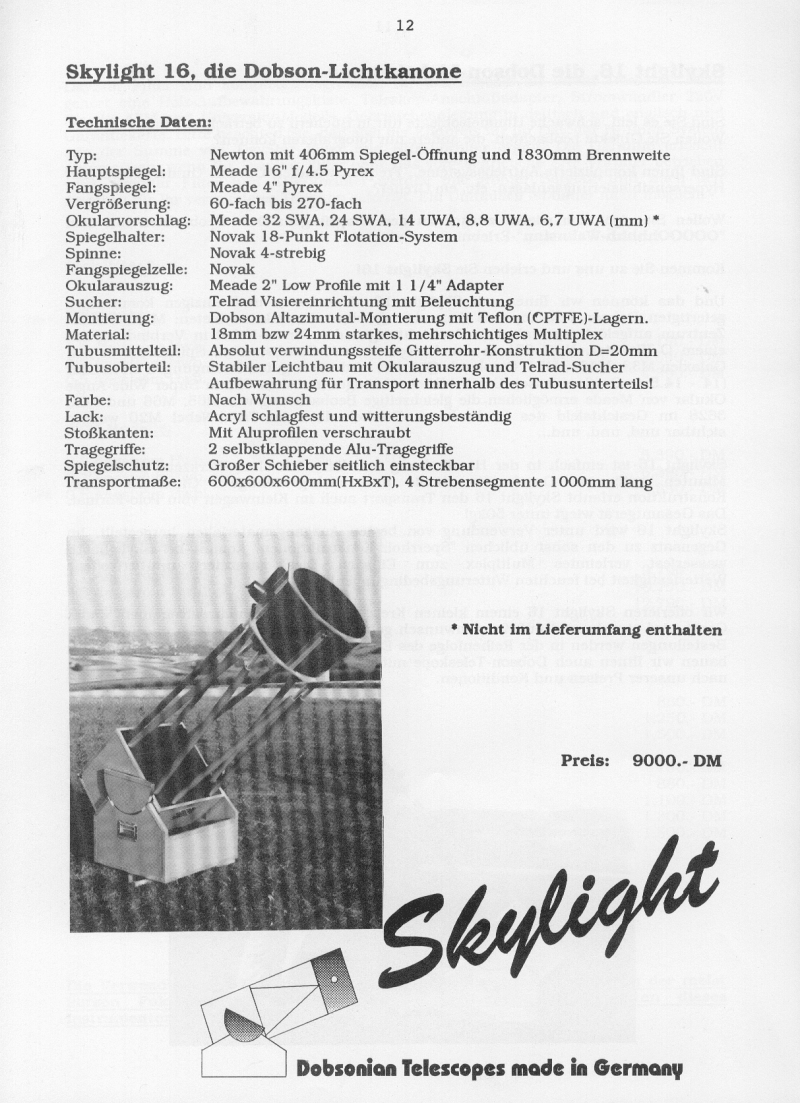 Das erste "Dobsonian Telescope made in Germany" ein grüner Skylight 16 Dobson, wurde von AiT an Pfingsten 1992 der FAA (Fachmesse für Amateurastronomie) in Laupheim präsentiert. Die Konkurrenz hatte damals kein vergleichbares Produkt vorzuzeigen, nur sehr einfache Odyssey Dobson Teleskope mit Papptuben von Coulter Optical, USA.