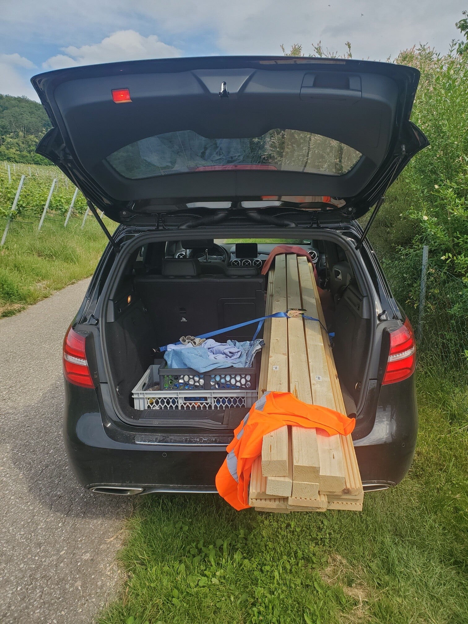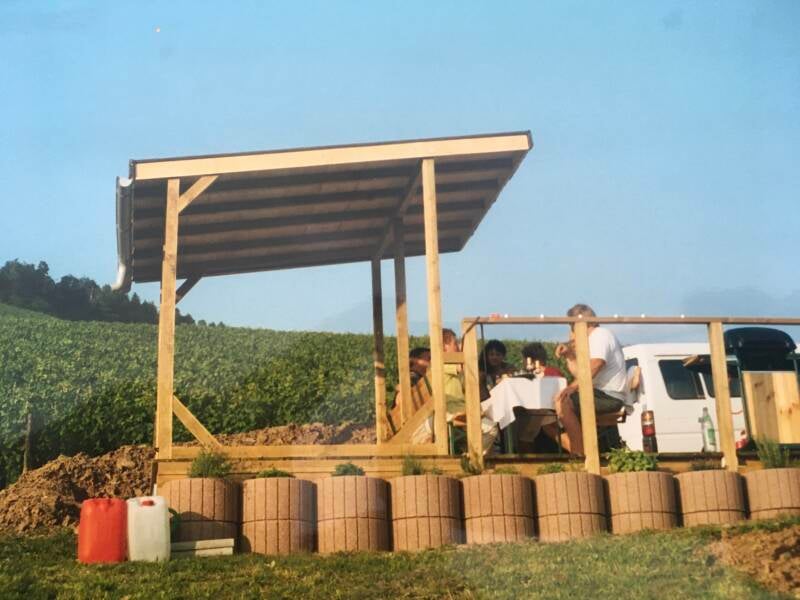 Das war ein Wengert, der nun auf 6 Kubikmeter komprimiert ist. Die alten Rebstöcke und Pfähle eines Wengerts im Dengler. Der Weinbauer hat Alle rausgerissen und eine neue Sorte Trauben gepflanzt. Aus den alten Pfählen habe ich einen Holzunterstand gebaut. In der Verlängerung gab es auch Platz für ein lang erwartetes Gartenklo mit Porta Potti Campingtoilette.